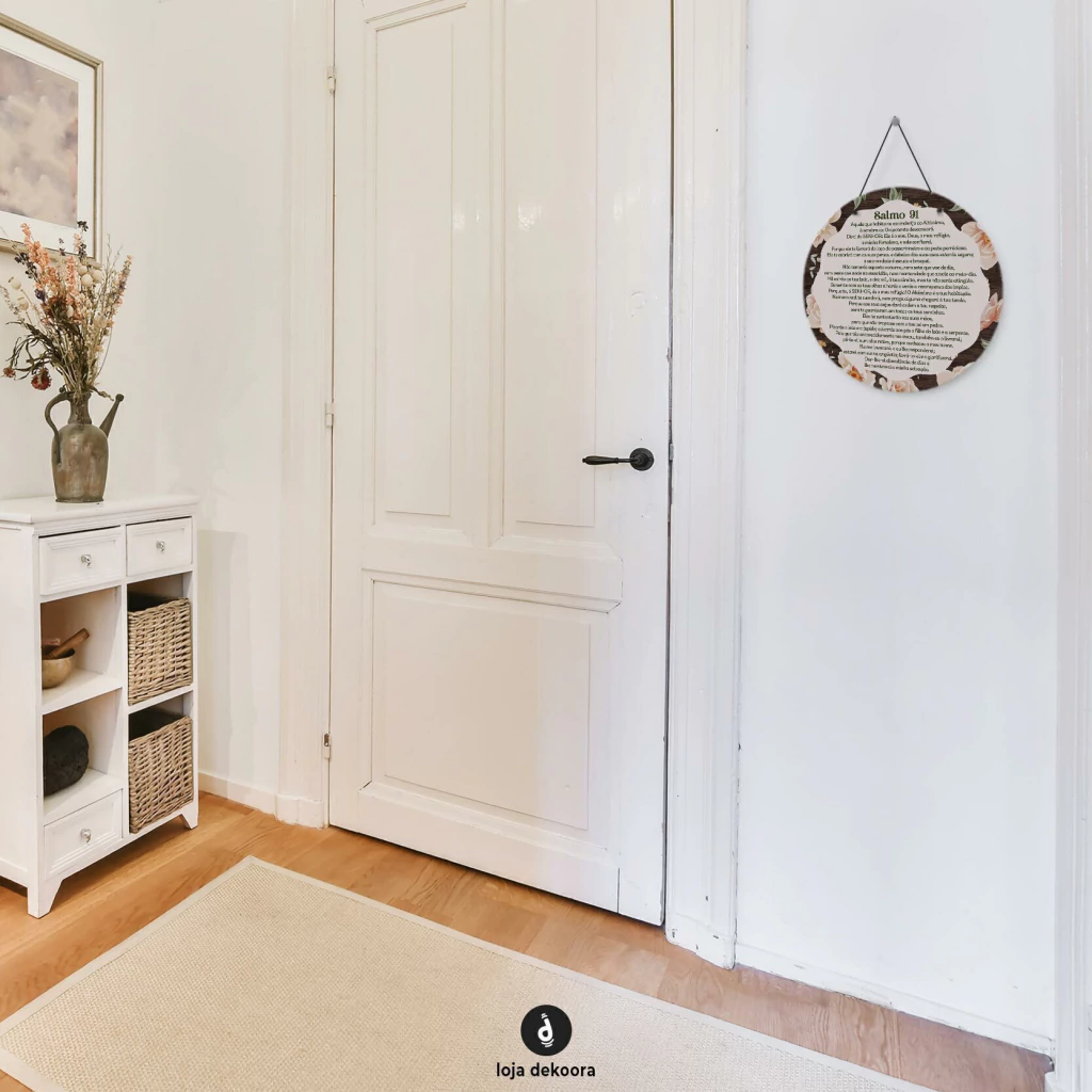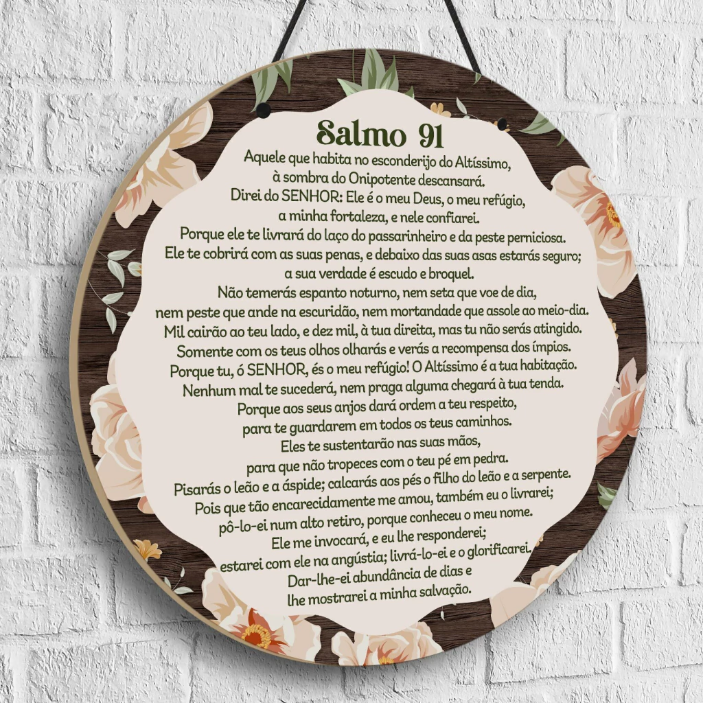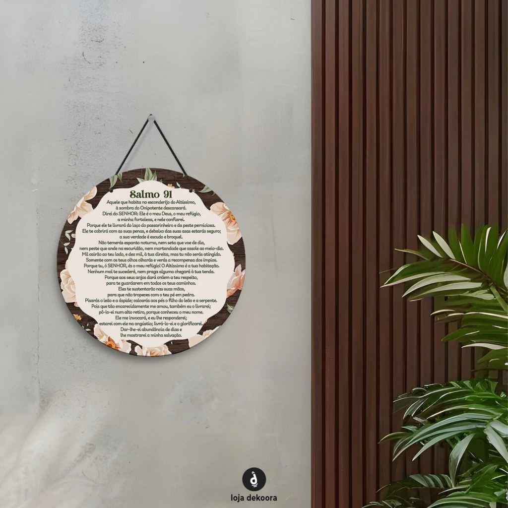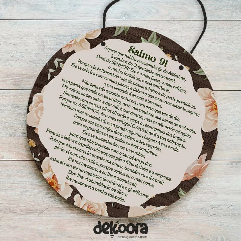 Nossa placa é adornada com um belo floral clássico que valoriza ainda mais o texto completo do Salmo 91, conhecido como o Salmo da Proteção.
