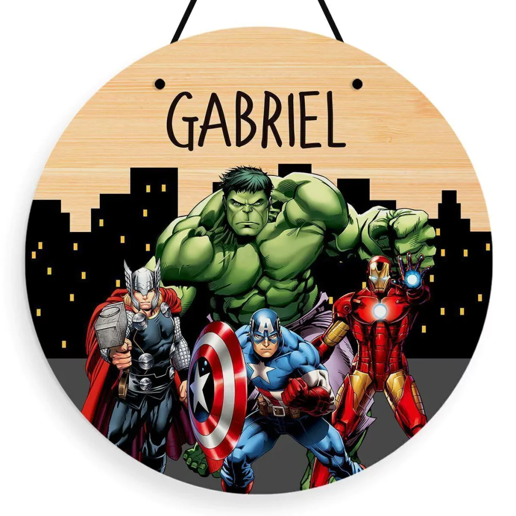 Transforme o quarto do seu pequeno herói em um mundo de aventuras com nossa plaquinha decorativa de porta temática de Super Heróis. Esta peça encantadora adiciona um toque mágico e personalizado à decoração do quarto da criança. Apresentando os super-heróis favoritos, esta plaquinha é um convite para a imaginação e diversão!